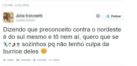 Em um dos posts, publicado no Twitter, uma das usuárias disse "meu c* que chamar nordestino de burro alienado e idiota é preconceito, os números tão (sic) aí pra provar". Outra, também no Twitter, falou "só aqueles nordestinos malditos que votam na Dilma, nossa espero que nunca mais chova lá pra (sic) sempre".