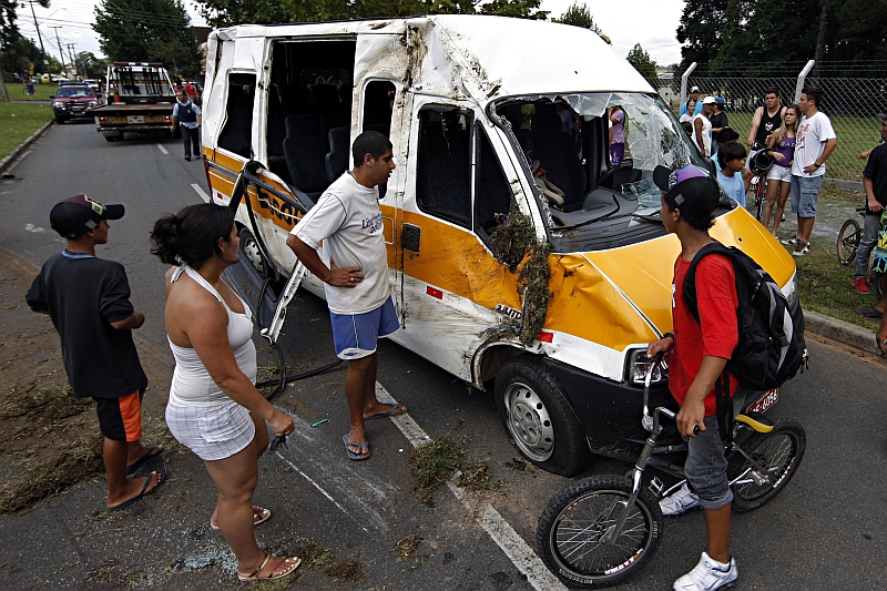 Um acidente envolvendo uma van escolar, no início da tarde de ontem, em Pinhais, na região metropolitana de Curitiba, deixou 12 crianças feridas, três delas em estado grave, segundo o Corpo de Bombeiros. De acordo com a Guarda Municipal de Pinhais, o veículo transportava 24 pessoas no momento do acidente (22 crianças e dois adultos), quatro acima de sua capacidade. A Guarda Municipal também informou que a van apelidada de "Tio Emerson" está em fase de licenciamento e não poderia transportar os estudantes. O motorista, Emerson José dos Santos, 32 anos, disse que transportava 19 crianças. A colisão aconteceu na Rua Jacarezinho, por volta das 12h50. Uma menina de 12 anos, com ferimentos na cabeça, foi levada pelo helicóptero da Polícia Rodoviária Federal para o Hospital Angelina Caron, em Campina Grande do Sul. Ontem à noite, ela aguardava resultados de exames na Unidade de Terapia Intensiva (UTI).
