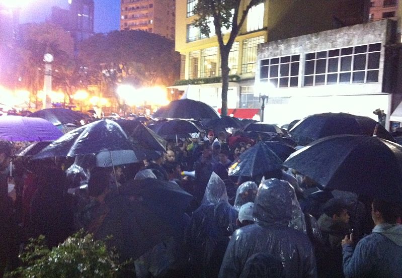 Na Boca Maldita, manifestantes se protegem da chuva enquanto aguardam para o início do quarto protesto contra a tarifa de ônibus