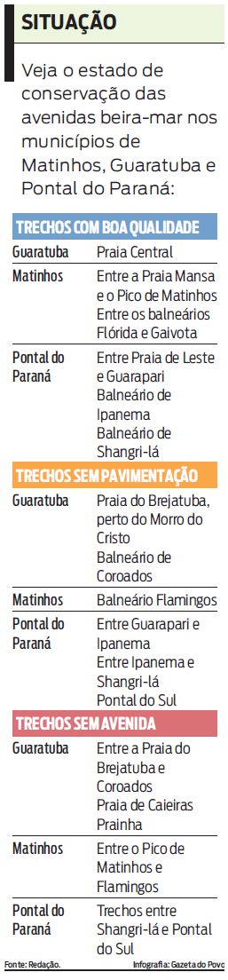Os locais mais frequentados pelos veranistas no Litoral, as avenidas beira-mar também conhecidas como Atlântica , ladeiam a orla e geralmente oferecem ciclovias, calçadas e comércio. Entretanto, em algumas praias movimentadas do Paraná essas ruas não apresentam boa qualidade em toda a extensão ou sequer existem.O caso mais precário está em Pontal do Paraná, município com cerca de 30 quilômetros de praias. Apesar de em alguns balneários, como Praia de Leste, Shangri-lá e Ipanema, apresentarem pavimentação, calçadas, chuveiros e ciclovias, a ligação entre eles é difícil. A Avenida Beira-Mar nos trechos entre as praias mais conhecidas não é pavimentada e nem sempre há calçadas para pedestres, o que desagrada a turistas e comerciantes.