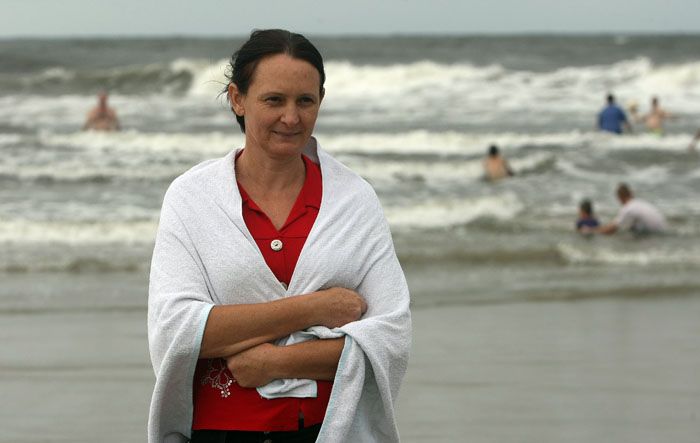 Mas nem todos que foram com a família para o mar na tarde fria tiveram a mesma coragem para entrar na água. A dona de casa Ivonete Rauch, 40 anos, veio de Sinop, Mato Grosso, para visitar uma irmã que mora em Matinhos. Levada pelos filhos Jean e Maurício até o mar, ela não se encorajou a entrar na água e preferiu assistir a dupla da areia, enrolada em uma toalha. "Só vim porque meus filhos queriam. Não tem como segurar as crianças em casa", afirma.