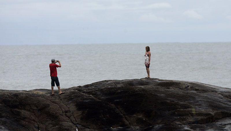 O casal de Ponta Grossa, nos Campos Gerais, a distribuidora Marisa Pereira Barabach, 50 anos, e o funcionário público federal aposentado Teófilo Barabach, 59 anos, aproveitam o tempo nublado para passear na orla. "Como não dá para aproveitar a praia, o jeito é caminhar", comenta Marisa. O casal vem para Matinhos todas as férias a quase 30 anos e fica no Litoral até o próximo final da semana.