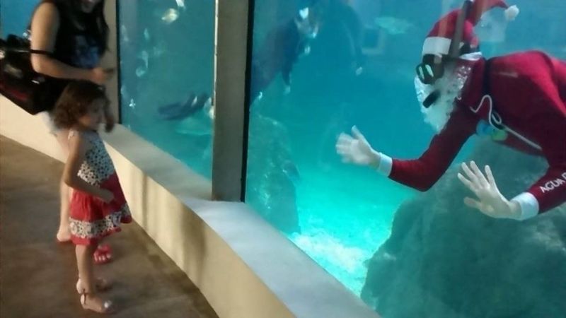 Quem visitou o Aquário de Paranaguá nesta quarta-feira (24) pôde encontrar uma nova atração no tanque Oceano. Um Papai Noel mergulhador brincou com crianças e adultos que estiveram no local para ver os peixes que habitam no maior tanque do aquário. O mergulho aconteceu às 15 horas."As pessoas estão gostando bastante do atrativo. São visitantes de várias faixas etárias que interagem com o mergulhador, tiram fotos e filmam o mergulho com os animais", explicou a responsável pela educação ambiental do Aquário, Carolina Meira, em entrevista à Agência de Notícias do Paraná, órgão oficial de comunicação do governo estadual.