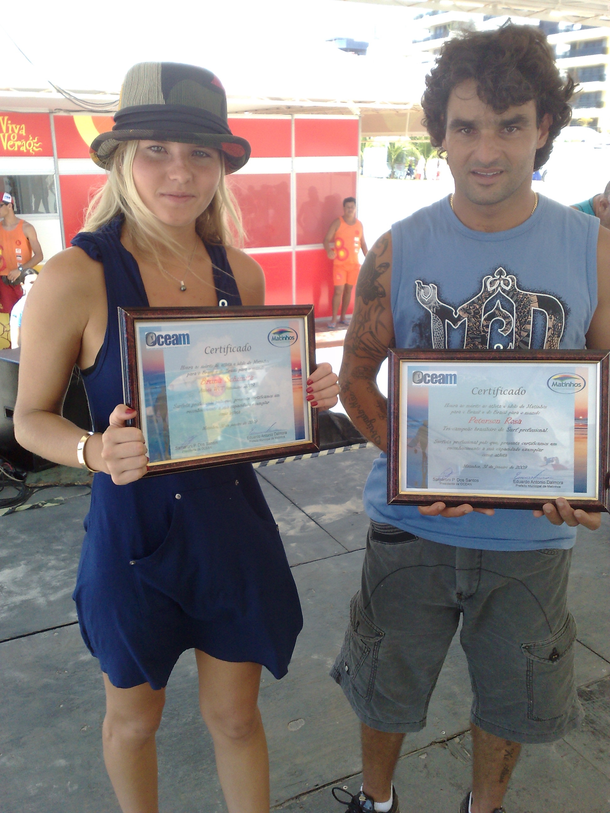 Os surfistas Peterson Rosa e Bruna Schimitz, dois destaques esportivos de Matinhos, foram homenageados na manhã deste sábado (31) em um palco montado na praia de Caiobá. O evento foi organizado pela prefeitura de cidade e pela Organização Centralizadora de Esportes Aquáticos do Município (Oceam).