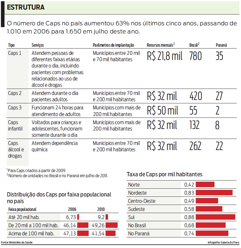 A falta de profissionais qualificados, especialmente médicos psiquiatras, também é outro fator que tem comprometido os trabalhos desenvolvidos nos Centros de Atenção Psicossocial (Caps). O Ministério da Saúde exige equipes mínimas para cada modalidade de centro. Os Caps 3, por exemplo, que funcionam 24 horas, precisam contar com pelo menos dois médicos psiquiatras, um enfermeiro com formação em saúde, cinco profissionais de outras categorias (como psicólogos e terapeutas) e oito profissionais de nível médio (técnicos administratvos, auxiliares de enfermagem etc.) No Paraná, só há dois Caps 3 funcionando, em Curitiba e Londrina.