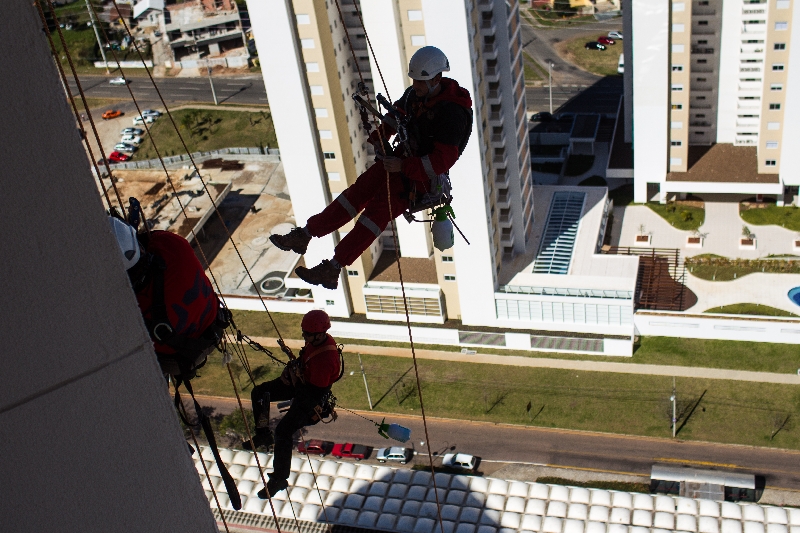 Basta dar uma volta pelos bairros Ecoville e Campo Comprido em uma ensolarada manhã de quarta-feira para vê-los por aí. Dependurados apenas por cordas às vezes um banquinho para descanso , trabalhadores fazem todo tipo de trabalho nas fachadas dos novos condomínios que se erguem na parte Oeste da cidade. E não apenas por ali. O trabalho de acesso por corda, também chamado de alpinismo industrial, é uma demanda cada vez mais frequente com a verticalização das grandes cidades, e ganha espaço no mercado pelo custo-benefício e pela agilidade no serviço.