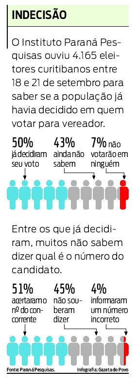Faltando pouco mais de dez dias para as eleições municipais, apenas metade do eleitorado curitibano já definiu seu candidato a vereador. Em uma sondagem realizada pelo Instituto Paraná Pesquisas, da quinta-feira passada ao domingo, 43% afirmaram que não sabem em quem vão votar. Outros 7% admitiram que não votarão em ninguém. Entre os que já se decidiram, muitos não souberam informar o número correto do concorrente, mostrando que a proximidade do pleito parece não ser suficiente para sensibilizar os eleitores quanto à necessidade de escolher o seu representante na Câmara Municipal.