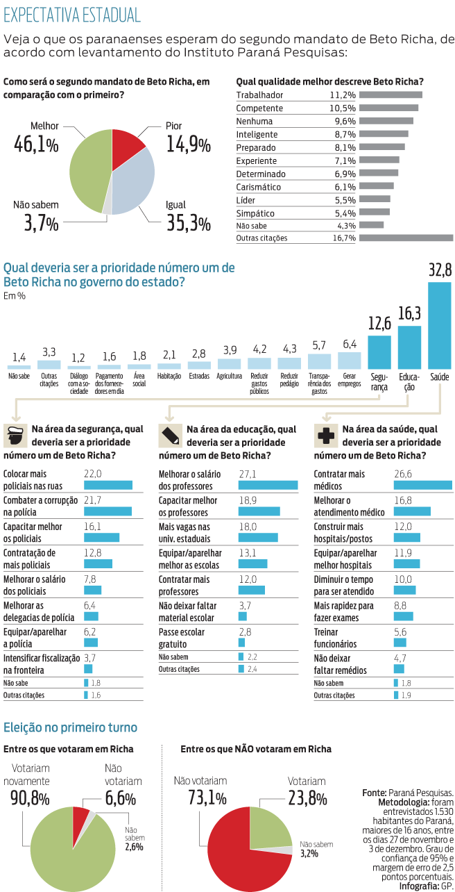 Os paranaenses defendem que a saúde seja a prioridade de Richa (32,75% das citações), seguida por educação (16,27%) e segurança pública (12,61%). O maior desejo para a saúde é que o governo contrate mais médicos (26,60%), sobretudo especialistas.