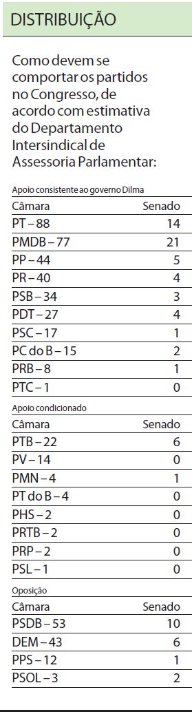 De acordo com estudo do Departamento Intersindical de Assessoria Parlamentar (Diap) sobre a nova formação do Congresso, que toma posse amanhã, 18 partidos vão apoiar Dilma na Câmara dos Deputados (veja tabela ao lado). Entre eles, dez são considerados aliados consistentes e oito oferecem "apoio condicionado". Há apenas quatro de oposição.