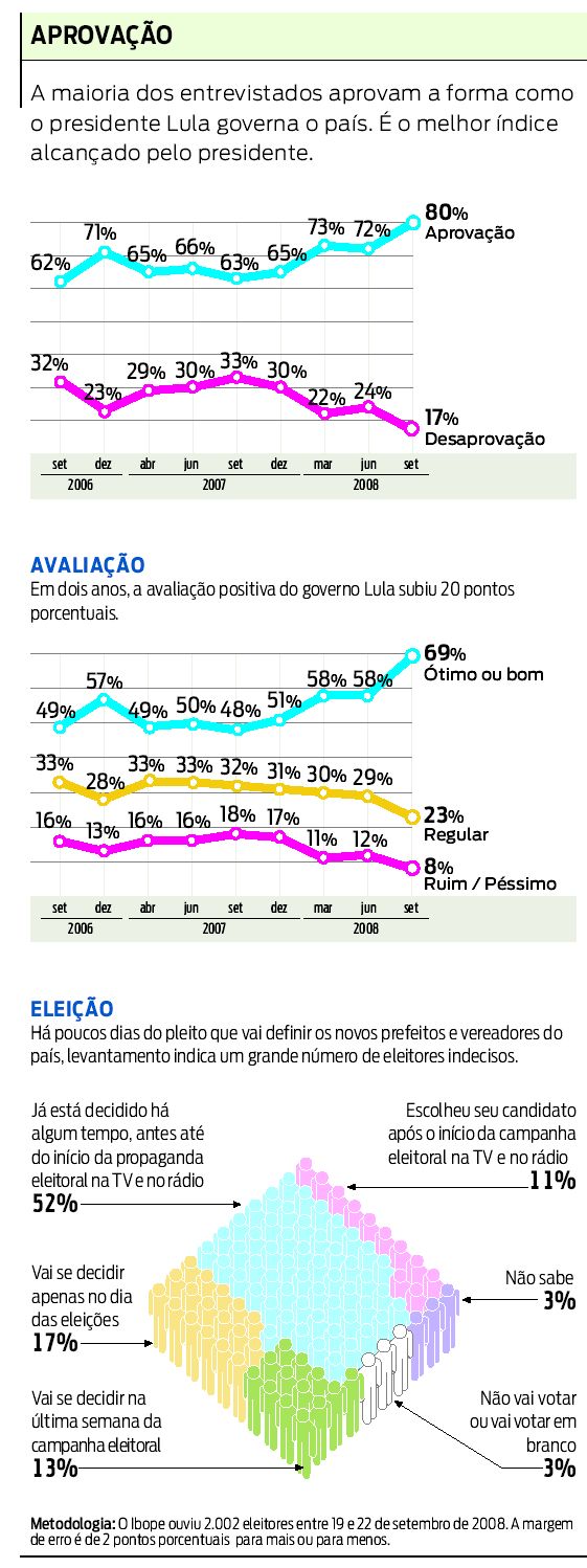 A aprovação do governo do presidente Luiz Inácio Lula da Silva saltou 11 pontos de junho a setembro, segundo pesquisa Ibope encomendada pela Confederação Nacional da Indústria (CNI) e divulgada ontem. A avaliação positiva do governo ótimo ou bom cresceu de 58% para 69%. Também cresceu, de 72% para 80%, a aprovação do desempenho pessoal do presidente Lula, enquanto a desaprovação caiu de 24% para 17%. Os melhores resultados foram alcançados no Nordeste, onde 92% aprovam a maneira como o petista governa. Ele também se saiu bem entre pessoas com renda familiar de até um salário mínimo (87%), moradores de municípios com até 20 mil habitantes (86%) e os que estudaram até a quarta série do fundamental (84%).