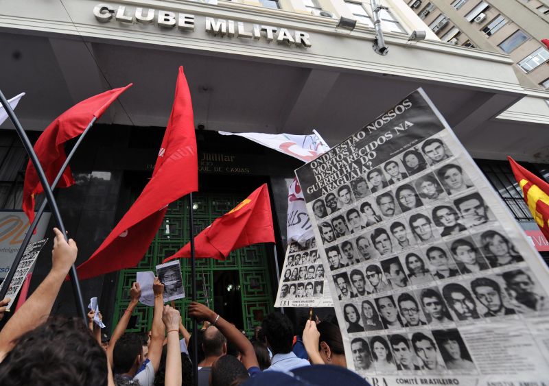 Na calçada, velas e tinta vermelha foram espalhadas para lembrar os mortos e desaparecidos durante a ditadura militar (1964-1985).