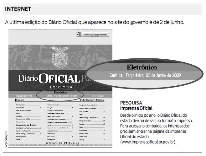 O cidadão paranaense que quiser consultar alguma edição do Diário Oficial do Executivo do Paraná pode ter de esperar até cinco dias para encontrá-lo disponível no site da Imprensa Oficial do estado. Essa diferença entre a data da edição e da publicação é considerada normal pelo governo, mas pode abrir uma brecha na legislação, na opinião de especialistas: antes da disponibilização pública, decretos e resoluções não poderiam entrar em vigor nem ser cobrados da população, ainda que posteriormente sejam publicadas com data retroativa.