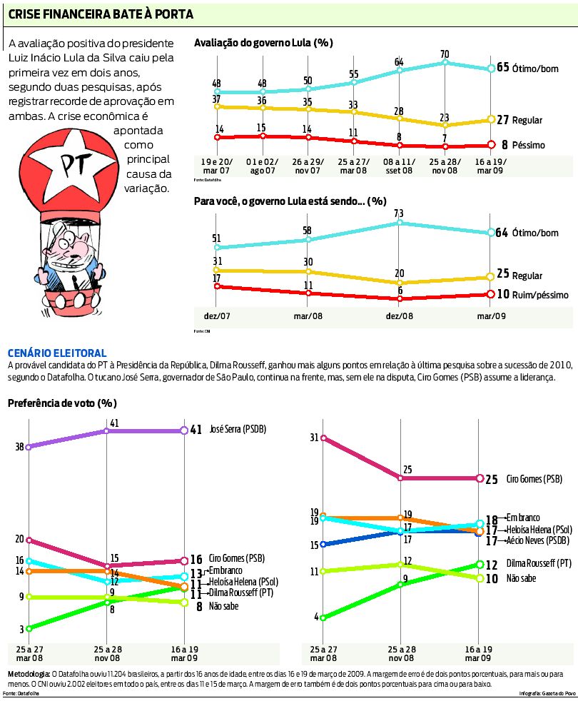 O resultado de duas pesquisas divulgadas ontem mostra que o agravamento da crise econômica começa a surtir efeito negativo sobre a popularidade do presidente Luiz Inácio Lula da Silva (PT). Pela primeira vez desde setembro de 2007, a pesquisa CNI/Ibope registra queda na avaliação positiva do governo do petista. Levantamento do Instituto Datafolha, publicada ontem pelo jornal Folha de S. Paulo, também indica popularidade menor.