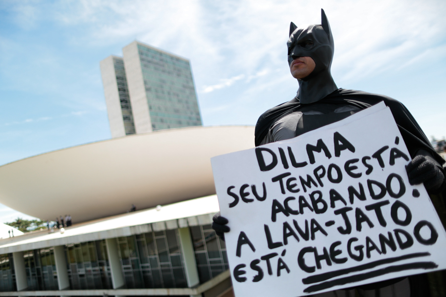 Na parte externa do Congresso, pessoas (entre elas um Batman) protestavam contra a corrupção, pediam intervenção militar no Brasil e o impeachment da presidente Dilma Rousseff.