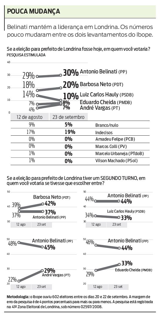A segunda pesquisa Ibope/RPC/Gazeta do Povo indica que deve haver segundo turno em Londrina. O deputado estadual Antonio Belinati (PP) subiu um ponto e continua na liderança, está com 30% das intenções de votos. Já o deputado federal Barbosa Neto (PDT) está com 20% dos votos. O também deputado Luís Carlos Hauly (PMDB) caiu quatro pontos e aparece com 10%.