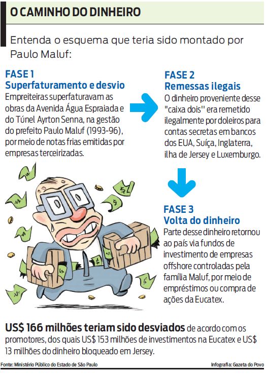 Segundo a acusação, parte do superfaturamento na construção da Avenida Água Espraiada e do Túnel Ayrton Senna foi enviado ilegalmente por doleiros para contas secretas no exterior e investido na Eucatex pelas empresas "offshore. "Se os bens da Eucatex não forem bloqueados pela Justiça brasileira, corre-se o risco de os tribunais da Suíça, de Jersey, da França e de Luxemburgo reverem o bloqueio de bens já determinado naqueles países, alega a promotoria.