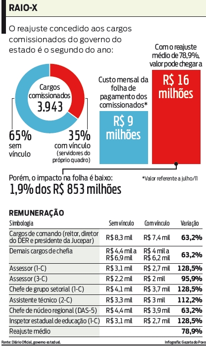 De acordo com o governo, o reajuste dos comissionados causará um impacto muito pequeno na folha de pagamento. De acordo com informações do Portal da Transparência do Executivo paranaense, há atualmente 3.943 pessoas em cargos de comissão, que não exigem concurso público. Esse é o maior número dos últimos anos entre 2008 e 2010, o contingente variou de 3.640 a 3.941.
