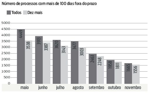 É claro que as publicações da coluna não tiveram nenhuma influência, mas a estatística demonstra que houve significativo avanço no período. O gráfico mostra que, em maio, o número de processos com mais de cem dias fora do prazo era de 4.499, dos quais 78% (3.538) de responsabilidade dos dez desembargadores mais atrasados. Em novembro, mês da última relação disponível, o total de processos na prateleira somava "apenas" 1.665. Os "dez mais" respondiam por 1.556 deles (93%).