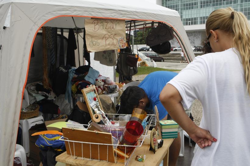 Enquanto não recebem a rescisão contratual, professores temporários – contratados via Processo Seletivo Simplificado (PSS) – que atuaram na rede estadual de ensino em 2014 montaram um bazar no acampamento dos grevistas (foto), em frente do Palácio Iguaçu. A R$ 1, eles vendem objetos doados por pais de alunos, como roupas e calçados. O dinheiro arrecadado é dividido entre os servidores que se revezam no bazar. O pedagogo Claudemar Lopes, de 27 anos, por exemplo, conseguiu pagar a mensalidade da pós-graduação que estava atrasada. A promessa do governo é quitar nesta terça -feira (24) a dívida de R$ 84 milhões com 29 mil professores do PSS.