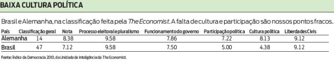 De onde decorrem essas diferenças de postura entre Alemanha e Brasil? A resposta é óbvia: da nossa falta de participação e de cultura política. Esse nosso déficit cultural é tão evidente que aparece inclusive no índice de Democracia de 2010, publicado pela Unidade de Inteligência da The Economist. Quando se trata de participação e cultura política, o Brasil perde de lavada da Alemanha (veja quadro).