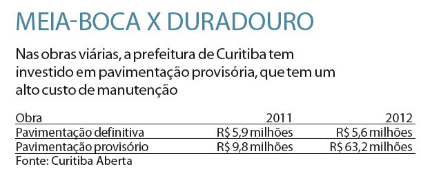 Em 2012, a prefeitura de Curitiba está gastando R$ 63,2 milhões com a pavimentação "alternativa". O investimento com asfalto definitivo soma apenas R$ 5,6 milhões. Só para efeitos de comparação: em 2011, o valor gasto com antipó e similares totalizaram R$ 9,8 milhões. O pavimento definitivo tinha orçamento até maior do que o deste ano: R$ 5,9 milhões.