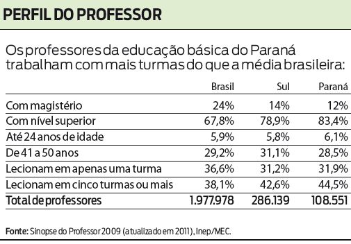 A intenção não é a de desanimar ninguém, pelo contrário. Sabendo das coisas, comparando nossa situação com a de outros, podemos reivindicar mais, e com propriedade. No geral, os professores da educação básica do Paraná cuidam de mais turmas do que os colegas do resto do Brasil. Dos 108,5 mil docentes da rede básica paranaense, 48.251 equivalente a 44,5% do total lecionam em cinco turmas ou mais. No país, o porcentual de professores com essa carga de trabalho é bem menor: 38,1%.