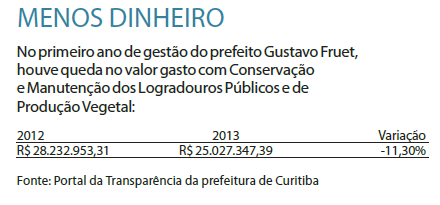 O Portal da Transparência da prefeitura informa que o valor gasto com Conservação e Manutenção dos Logradouros Públicos e de Produção Vegetal caiu 11% em 2013.