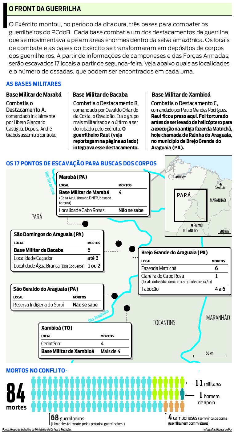 Um grupo formado por 30 representantes do Ministério da Defesa, do governo do Pará e de entidades civis começa amanhã a vasculhar 17 locais onde possivelmente estão enterrados os corpos de 67 militantes do PCdoB que integraram a Guerrilha do Araguaia grupo armado de esquerda que existiu entre 1966 e 1974, no Sul do Pará e Norte do Tocantins. Os guerrilheiros pretendiam derrubar o governo militar e instalar o comunismo no Brasil, mas foram mortos por integrantes do Exército.