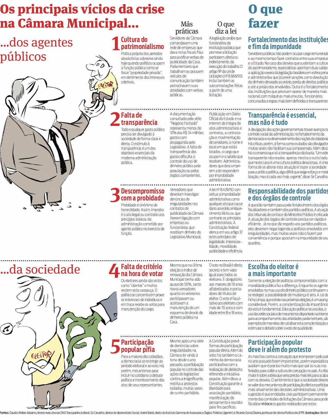Na busca de soluções para a crise, a Gazeta do Povo consultou especialistas em administração pública. Pelo link com o título: "Veja quais são os principais vícios da crise na Câmara Municipal", no Saiba Mais abaixo, você poderá ampliar as sugestões de medidas