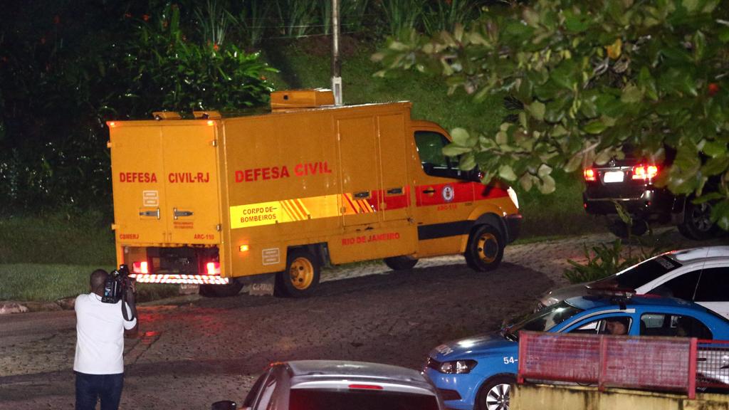 Três mergulhadores do Quartel da Barra da Tijuca do Corpo de Bombeiros participam do resgate. O helicóptero não pode ir até o local do acidente por conta do mau tempo.