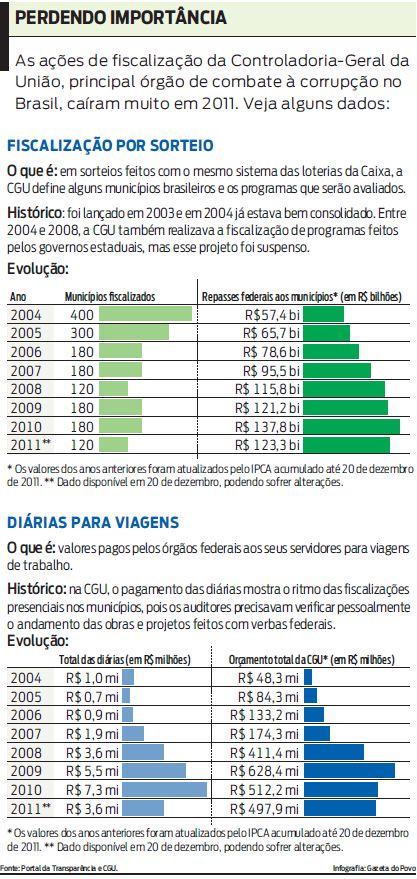 O contingenciamento de verbas do governo federal atingiu em cheio o principal órgão de combate à corrupção no Brasil. O orçamento da Controladoria-Geral da União (CGU) de 2011 foi congelado, e os dados da semana passada indicavam que o valor poderia ser o menor dos últimos três anos. Sem verba, o órgão reduziu pela metade o valor das diárias, utilizadas pelos auditores em viagens de fiscalização. Resultado: apesar dos repasses federais aos municípios terem sido recordes neste ano, o número de cidades vistoriadas foi o menor já registrado.