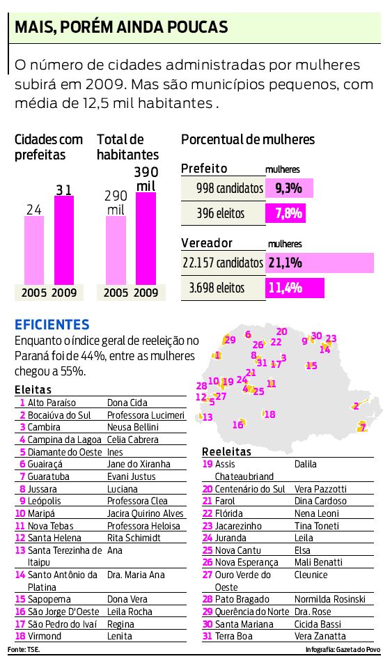 Nunca, no Paraná, uma grande cidade foi administrada por uma mulher. O maior município comandado por uma prefeita é Santo Antônio da Platina, com 40 mil moradores. De acordo com os dados da Justiça Eleitoral, as eleitas são médicas, professoras, donas de casa, em sua maioria. As eleitas têm idades entre 29 e 61 anos. Mais da metade delas tem curso universitário e 90% ao menos ensino médio completo.