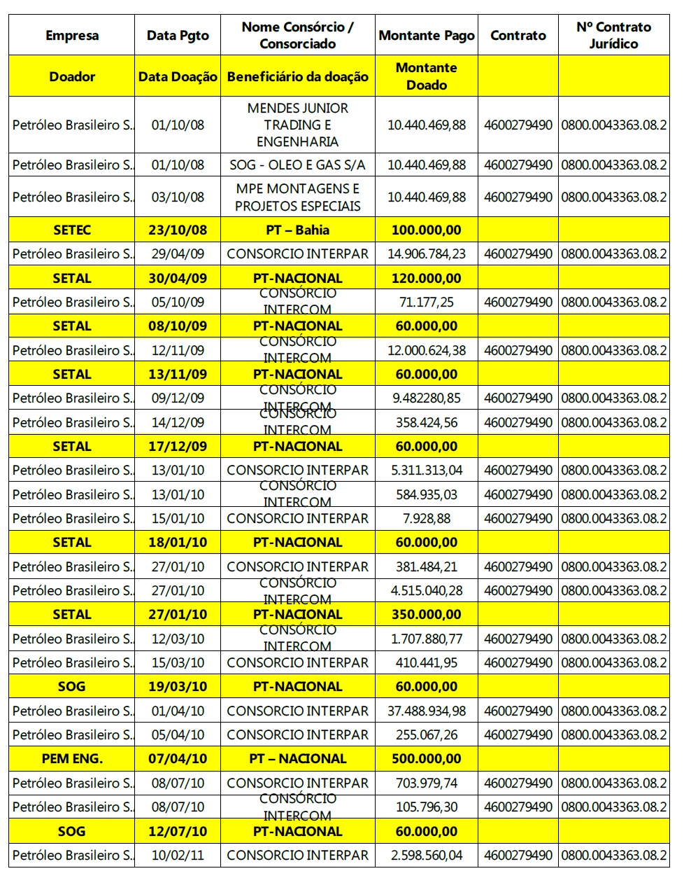 “A vinculação entre as doações políticas e os pagamentos feitos pela Petrobrás aos Consórcios Interpar e Intercom pode ser comprovada pela comparação entre as datas em que a Petrobrás pagou os consórcios e as datas, subsequentes, em que empresas controladas por Augusto Mendonça promoveram a transferência de propina disfarçada de doações oficiais para partido político”, sustenta a denúncia do MPF.