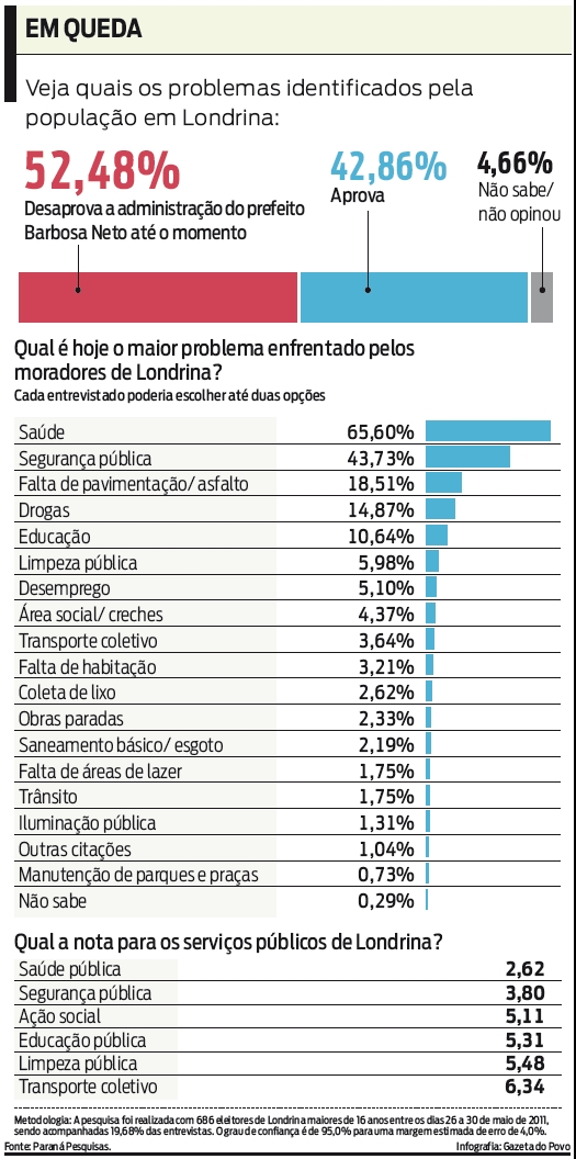 No levantamento do Paraná Pesquisa, a gestão da saúde pública em Londrina é considerada pela população da cidade no Norte do estado como foco dos maiores problemas do município. Cada entrevistado poderia indicar duas áreas que considerasse críticas e o descontentamento com a saúde foi apontado por 65,6% dos pesquisados. Segurança pública, com 43,73%, ficou em segundo lugar.