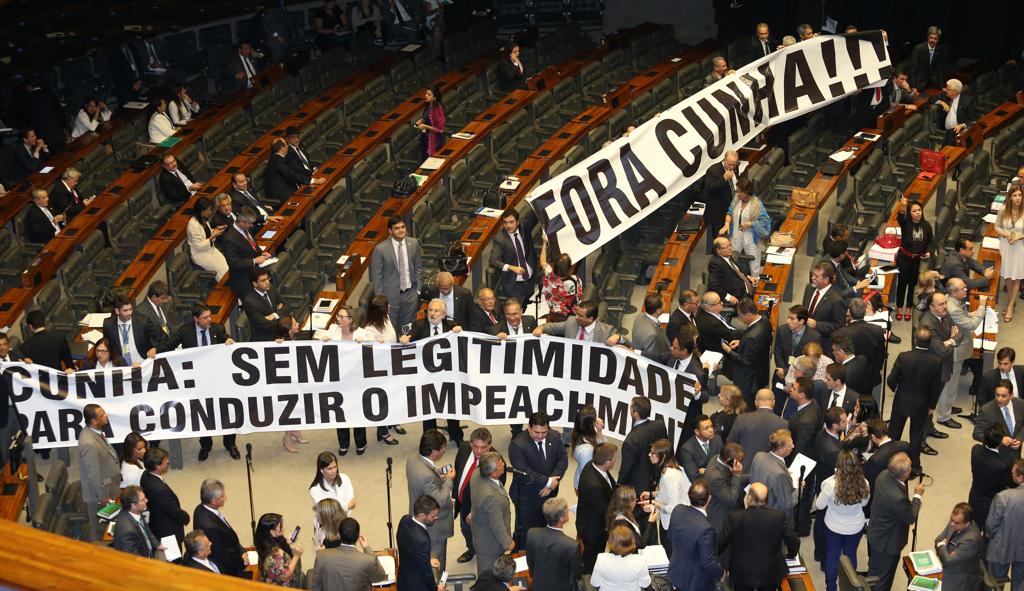 Em protesto contra a permanência do presidente da Câmara, Eduardo Cunha (PMDB-RJ) na Presidência da Casa, deputados do PSOL e do PT abriram em plenário, nesta terça-feira, uma faixa em que se lia em letras grandes: “Fora Cunha” e “ Cunha sem legitimidade para conduzir o impeachment”.
