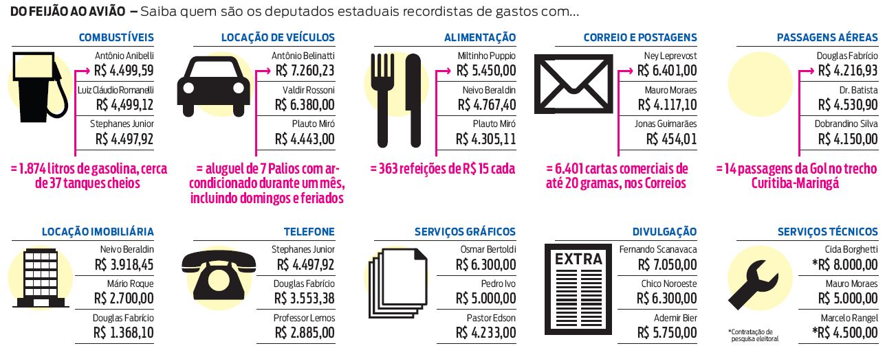 As despesas de agosto mostram que boa parte dos deputados repassou dinheiro para vários rádios e jornais do Paraná. Eles também usaram a verba para encomendar pesquisas de opinião pública, comprar muita comida, alugar veículos e colocar combustível para rodar por suas regiões.
