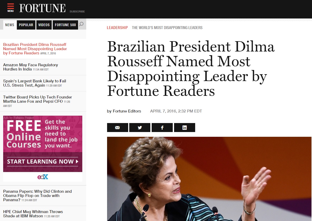 Na avaliação da Fortune, a expectativa era que a presidente continuasse o trabalho do antecessor, Luiz Inácio Lula da Silva, mas, ao invés disso, ela “se tornou conhecida pela suposta má gestão das contas públicas e pela acusação de sua campanha saber de um os maiores esquemas de corrupção de todos os tempos”.
