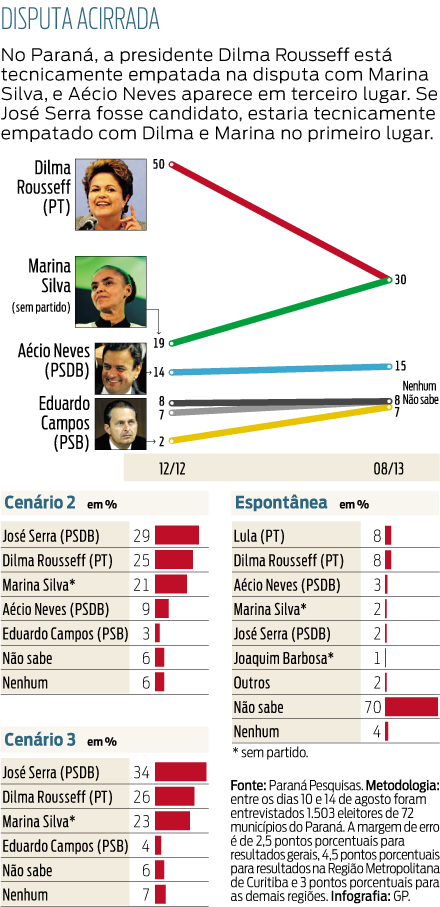 Para a cientista política Luciana Veiga, da Universidade Federal do Paraná (UFPR), o que mais chama a atenção na sondagem é a diferença de cenário quando o candidato tucano é José Serra. "Nas pesquisas nacionais, Serra realmente tem um desempenho melhor do que Aécio. Mesmo assim, ele não é capaz de virar o jogo com Dilma. Porém, no Paraná, ele consegue abalar a disputa", diz. Apesar de ser da mesma legenda do senador Aécio Neves, pré-candidato pelo PSDB, Serra tem sido sondado por outros partidos para ser candidato à Presidência.