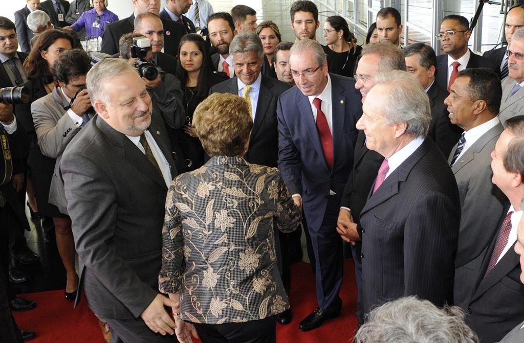 A presidente Dilma Rousseff chegou nesta tarde de terça-feira (22) ao Congresso para a sessão de abertura dos trabalhos legislativos deste ano. Ao desembarcar com 30 minutos de atraso, a petista foi recepcionada pelo presidente do Congresso, senador Renan Calheiros (PMDB-AL). Dilma cumprimentou com beijos Renan e o presidente do Supremo Tribunal Federal (STF), Ricardo Lewandowski, mas só deu um aperto de mão frio no presidente da Câmara, Eduardo Cunha (PMDB-RJ), responsável por ter admitido em dezembro a abertura do processo de impeachment contra ela.