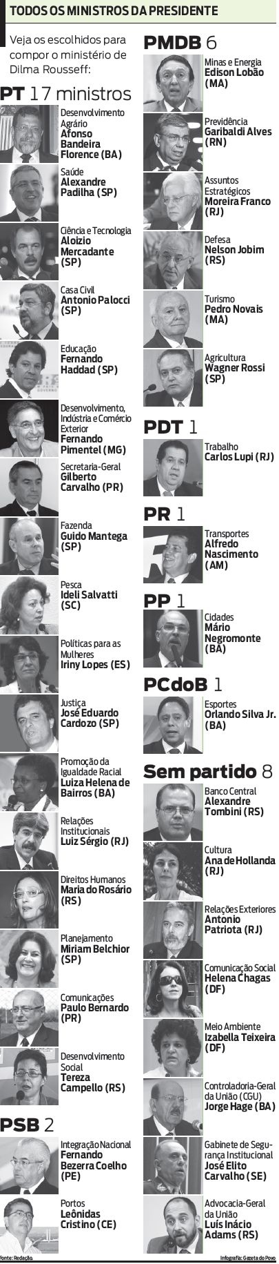 As costuras finais acabaram dando mais trabalho do que a eleita imaginava ela desejava concluir seu ministério até a diplomação no Tribunal Superior Eleitoral, na sexta-feira passada. As diversas tendências do PT pressionaram a eleita. Convicta de que precisava aumentar a cota feminina e do Nordeste, Dilma chegou a convidar a secretária de Desenvol_vimento de Sergipe, Maria Lucia Falcón, para o Desenvolvimento Agrário. Teve problemas com a tendência do PT Democracia Socialista, que comanda a pasta. Ao final, manteve um nome do Nordeste, mas da ala petista.