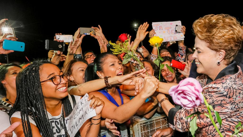 Depois de receber um grupo de 15 mulheres que participavam de uma manifestação no Palácio do Planalto defendendo sua permanência no cargo, a presidente Dilma Rousseff saiu de seu gabinete na noite desta terça-feira (19), no terceiro andar, foi para o segundo andar e, num gesto absolutamente inusitado, desceu a rampa do Palácio em direção às manifestantes.