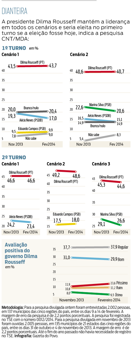 A presidente Dilma Rousseff seria reeleita no primeiro turno se as eleições fossem hoje, mas a avaliação positiva do governo interrompeu a trajetória de recuperação após a onda de protestos de junho do ano passado, segundo pesquisa divulgada ontem pela CNT (Confederação Nacional do Transporte), feita pelo instituto MDA. Dilma obteve 36,4% de avaliação positiva e a avaliação negativa foi de 24,8%. Em novembro do ano passado, a avaliação positiva da presidente havia sido de 39%, a melhor após a queda brusca detectada em julho quando a aprovação do governo havia chegado a apenas 31,3%.