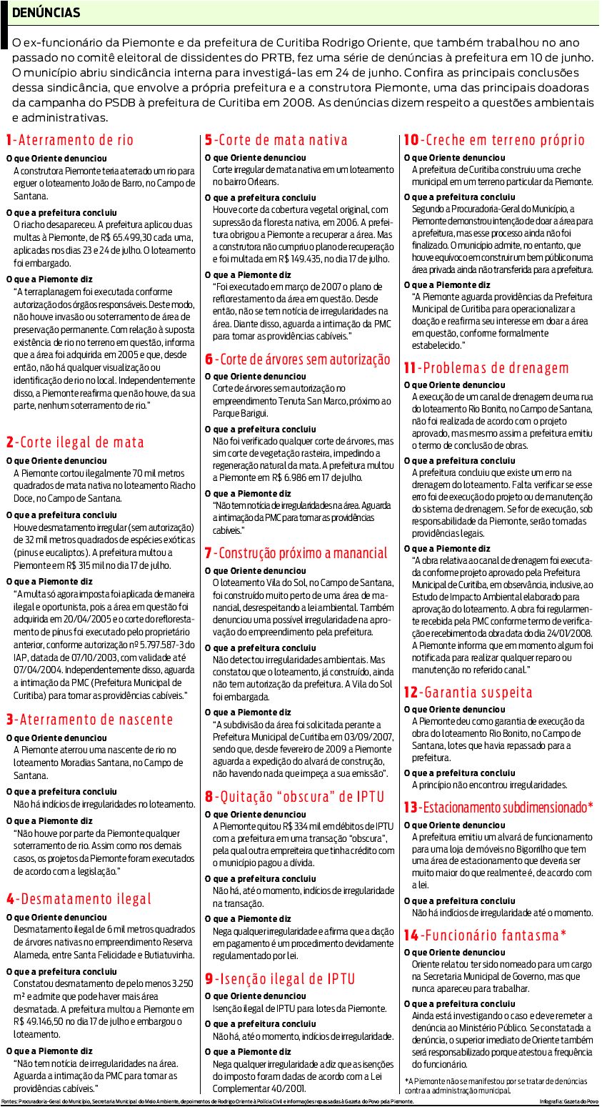 A partir dessas denúncias, a prefeitura já comprovou que a construtora desmatou áreas para construir um loteamento, sem alvará do município. Também há fortes indícios de que a Piemonte teria aterrado um rio para erguer um empreendimento popular batizado de João de Barro, no bairro do Campo de Santana, Sul de Curitiba.