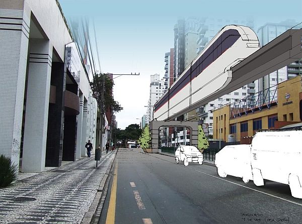 Para Camargo, o projeto da prefeitura tira os ônibus das ruas. O candidato apresentou a proposta do monotrem, que ficaria por cima das canaletas dos biarticulados. Uma estrutura seria feita e o monotrem passaria por cima dos ônibus, que continuariam a circular pelas canaletas. "Meu projeto custa 1/3 do valor [do projeto da prefeitura] e levaria três anos para ser implantado. Nosso projeto é um metrô de superfície, para dar agilidade e conforto às pessoas. Assim não perdemos o transporte coletivo", disse.