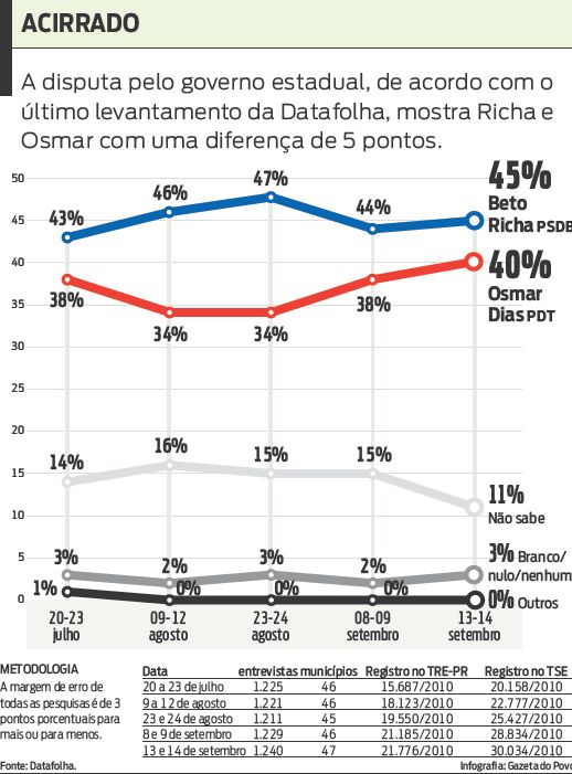 O Datafolha ouviu 1.246 pessoas em 47 municípios paranaenses entre os dias 13 e 14 de setembro. A margem de erro é de 3 pontos porcentuais para mais ou para menos. A pesquisa está registrada no Tribunal Regional Eleitoral do Paraná (TRE-PR) com o número 21.776/2010 e no Tribunal Superior Eleitoral (TSE) 30.034/2010.