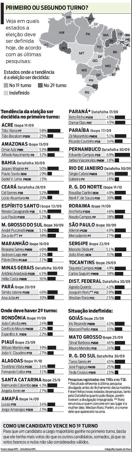 A escolha dos próximos governadores deve ser rápida e plebiscitária. No quadro apresentado pelas pesquisas Ibope e Datafolha, publicada na última semana, em 18 estados, além do Distrito Federal, os novos governantes devem ser conhecidos neste domingo. Destes, onze concorrem à reeleição. Esse resultado significa um aumento do número de estados que não terão segundo turno, se comparado com as últimas eleições estaduais, em 2006, quando 17 governadores foram eleitos na primeira etapa das eleições.Das disputas, duas chamam a atenção pela intenção de votos: em Pernambuco, onde o governador Eduardo Campos (PSB) concentra 78% dos votos válidos e no Rio de Janeiro, onde o governador Sérgio Cabral (PMDB) tem 67% dos votos válidos, segundo as projeções das pesquisas divulgadas até este sábado.