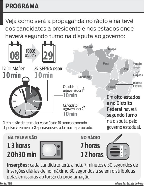 No segundo turno, os candidatos terão o mesmo tempo no horário eleitoral, 20 minutos diários dividos em dois blocos. Além da propaganda em bloco, cada candidato terá, ainda, 7 minutos e 30 segundos de inserções de no máximo 30 segundos, que serão distribuídas pelas emissoras ao longo da programação diária. A propaganda no rádio e na tevê termina no dia 29 de outubro. Até lá, cada candidato terá alcançado 165 minutos de propaganda eleitoral gratuita, divididos em 330 inserções.