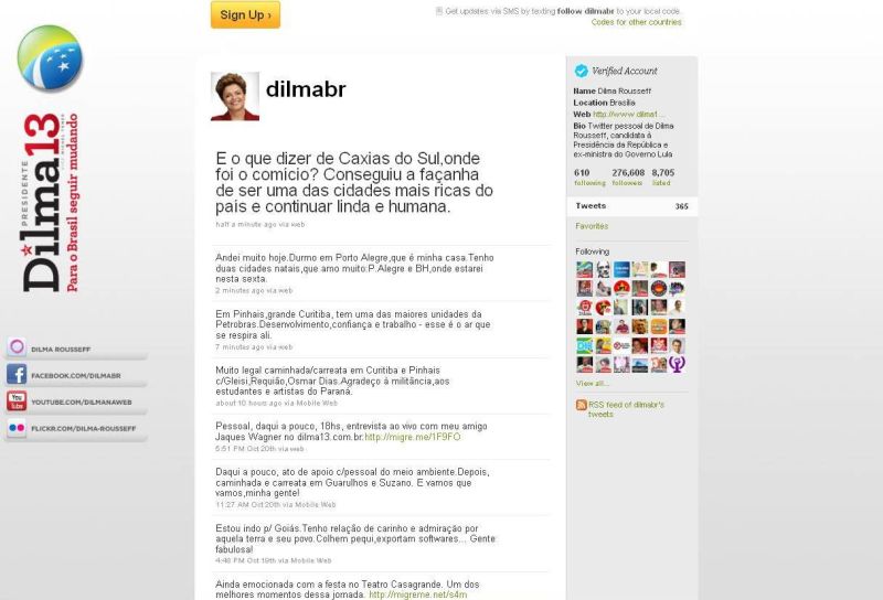 Depois da eleição norte-americana, em que o presidente Barack Obama foi eleito com grande mobilização de militantes pelo Twitter (rede mundial de microblogs), era grande a expectativa para o uso do site nas eleições brasileiras. Porém, a importância não foi a esperada. Como não foi um espaço para a discussão de propostas e debate de ideias, o Twitter acabou servindo para que os candidatos desabafassem, atacassem seus adversários e, vez ou outra, produzissem algumas gafes. A mais recente aconteceu na quinta-feira, na passagem da candidata do PT à Presidência, Dilma Rousseff, por Curitiba e região metropolitana. Dilma (ou sua assessoria) se confundiu e escreveu que a Refinaria Presidente Vargas (Repar) fica em Pinhais. Na verdade a refinaria fica em Araucária, onde foi construída em 1976.