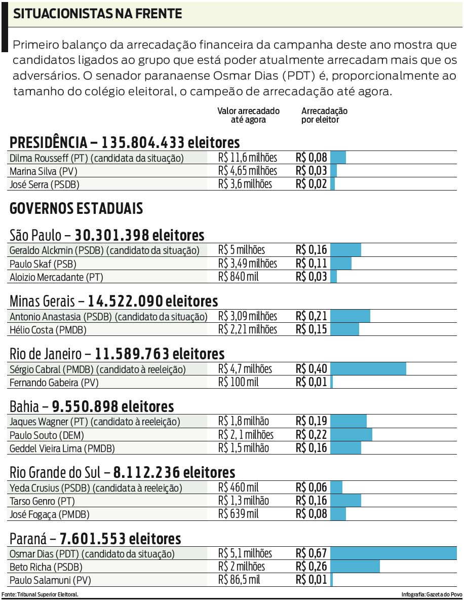 A divulgação da primeira prestação parcial de contas dos candidatos às eleições deste ano revelou que, na maioria dos casos, os candidatos à reeleição ou que são apoiados pelo atual governante conseguiram mais doações do que os outros no primeiro mês de campanha. A situação se repete na disputa presidencial e em quatro dos seis maiores colégios eleitorais do Brasil, incluindo o Paraná. Os números mostram ainda que o senador paranaense Osmar Dias, candidato ao governo do estado pelo PDT, é o que mais recebeu proporcionalmente ao número de eleitores. Até agora, o pedetista arrecadou R$ 0,67 por eleitor.