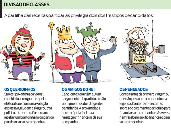 O dinheiro doado pelos partidos aos candidatos cuja origem são as verbas do fundo partidário ou doações ocultas de financiadores que não querem aparecer na prestação de contas entregue à Justiça Eleitoral normalmente é dividido para dois tipos de candidatos: os dirigentes da legenda e os chamados "puxadores de voto" concorrentes com maior potencial eleitoral, capazes de fazer uma votação expressiva e, assim, ajudar a eleger outros candidatos do partido devido ao sistema eleitoral.